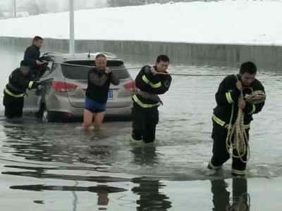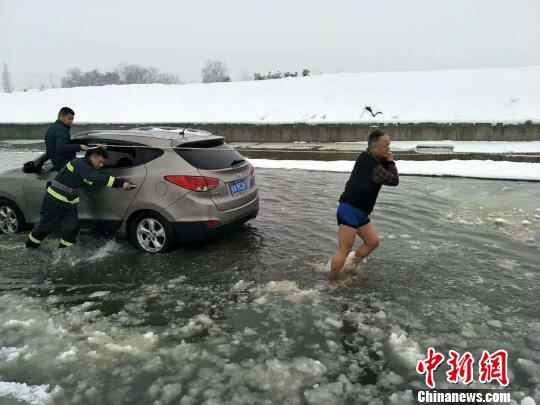 放下电话后,张大银与同事立即前往了现场。“那一块地势比较低洼,经常会有积水,早上天不亮地又滑,他们可能没有注意到,。”到达现场后,张大银看到积水较深,考虑到雪天警情多,没有时间回家换衣服,不想耽误工作的他,便脱下了长裤,身着短裤就下了水。
