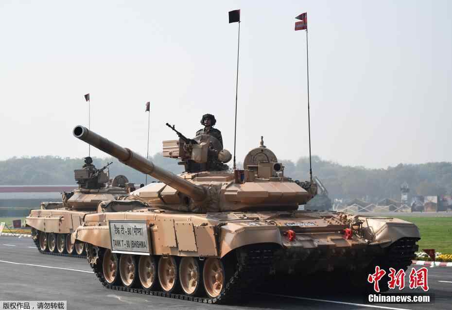 当地时间1月15日,印度在新德里举行建军节70周年阅兵仪式,摩托车叠罗汉、T-90主战坦克轮番上阵表演。图为T-90主战坦克亮相阅兵式。