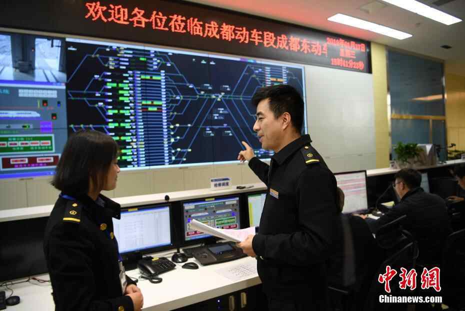 1月17日,动车列车检测调度室内一片繁忙。当日,成都动车段成都东动车运用所内一片繁忙,技术人员加班加点对列车进行全面检查迎战春运。春运前将有117列动车组陆续接受车内外、车底以及行车数据分析等项目“体检”和“美容”,确保2018年春运列车需求。中新社记者 刘忠俊 摄