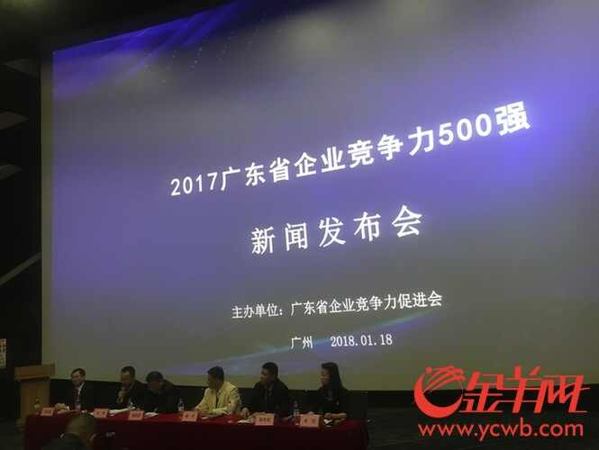 金羊网讯 记者区健妍报道:2018年1月18日上午,由广东省企业竞争力促进会主办的“2017广东省企业竞争力500强新闻发布会”在广州海珠金逸影城举行。广东省企业竞争力促进会魏启超会长、张明副会长、张宇宏秘书长,以及广东省体制改革研究会副会长杨平教授和部分“2017广东省企业竞争力500强”入选企业代表出席本次发布会,来自广东省内外的近三十家新闻主流媒体到会采访。