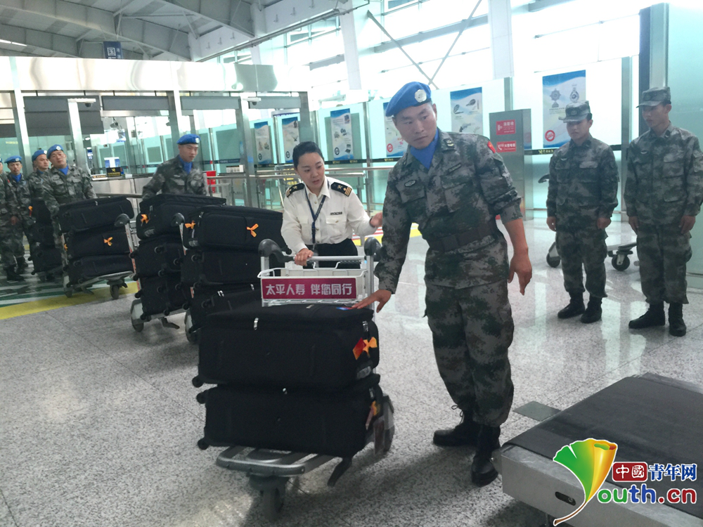 曲媛正在帮助中国维和部队官兵出境通关。大连机场海关旅检科供图