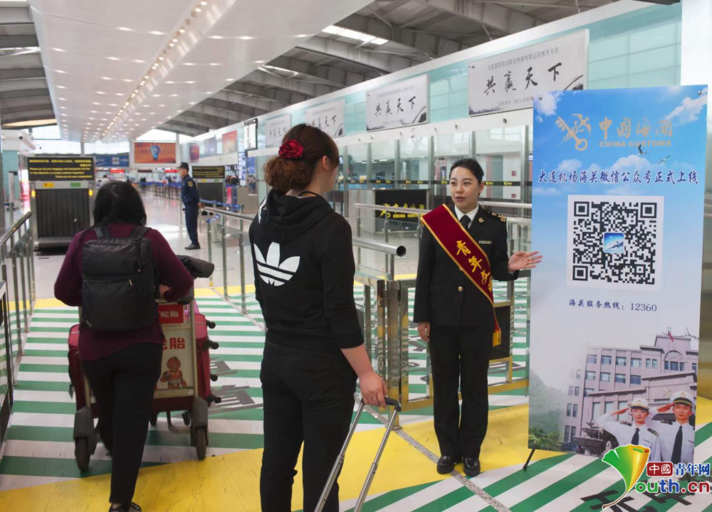 为进一步提高服务质量与工作效率,大连机场海关于2015年创立大连机场海关微信公众号,用于政务公开和法制宣传,曲媛正在向出境旅客介绍微信公众号内容。大连机场海关旅检科供图