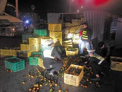 货车侧翻水果撒一地 热心警民齐当搬运工