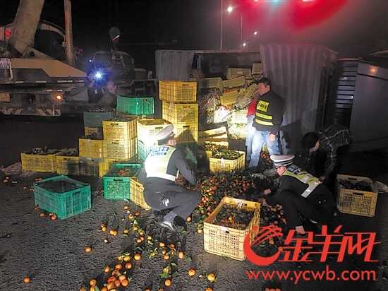 据驾驶员陈先生介绍,当时其驾车往广州方向行驶,因货车刹车失灵,撞上前面一辆等候红绿灯的小客车。事故中货车侧翻,小车受损,所幸无人员伤亡,但货车上3吨价值约3万元的砂糖桔就撒落一地,占满了两条车道,如果不及时捡起来,被过往的车辆碾压将会造成更大损失。由于时值深夜,车主找了个遍也难以请到工人帮忙收拾水果,显得既焦急又无奈。让陈先生感到暖心的是,在场警辅人员快速完成现场事故勘查后,立即投入到救援工作中,当起了“搬运工”。随后赶到的拖车公司工作人员也伸出援手,帮助司机尽量减少损失。