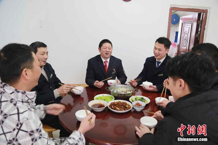 近日,重庆歌乐山“迷你”火车站的工作人员春运期间进行24小时的轮流值班。据悉,该火车站小站常驻职工仅有6人,只办理列车会让和越行,每日接发列车80对,其中动车高铁50对。图为火车站工作人员正在一起吃饭。苏自刚 摄