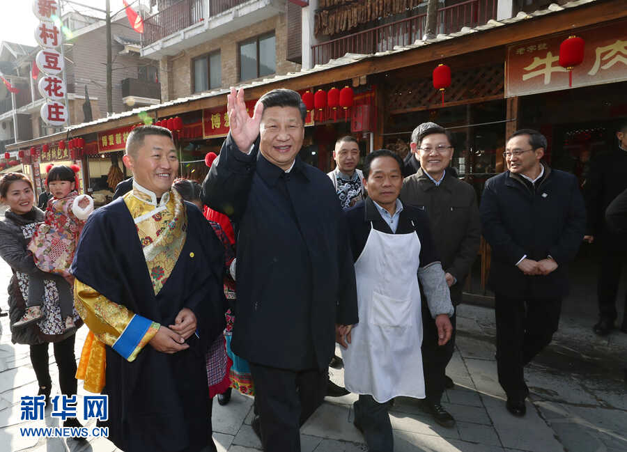 中华民族传统节日农历春节来临之际,中共中央总书记、国家主席、中央军委主席习近平来到四川考察调研,看望慰问各族干部群众,向全国各族人民致以美好的新春祝福。这是2月12日上午,习近平在阿坝藏族羌族自治州汶川县映秀镇场镇考察。新华社记者 鞠鹏 摄