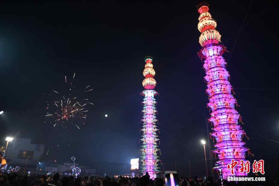 3月1日,高大的花灯与远处的烟花遥相呼应。当日,浙江温岭上王村举行元宵特色民俗展示活动,24米高的“王氏大彩灯”亮相现场,为即将到来的元宵佳节增添喜庆。中新社记者王远 摄