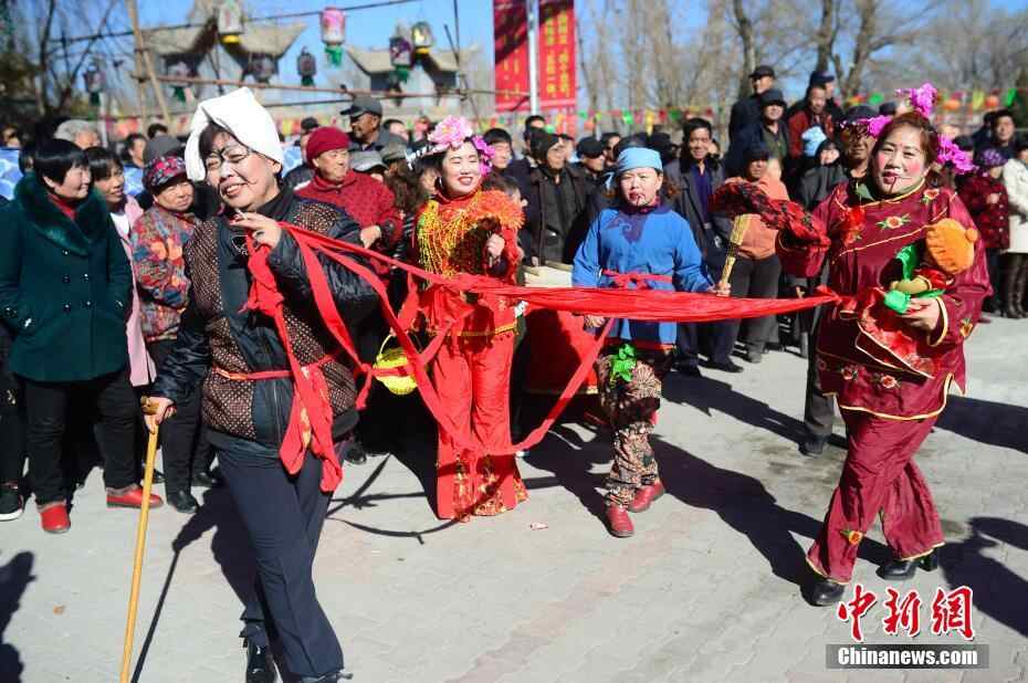 3月1日,村民扮演老汉领三个媳妇。当日,内蒙古呼和浩特市托克托县举办庆祝元宵节社火表演,跑驴、抬皇杠、踩高跷、扮丑等表演纷纷亮相,演员多为村民,他们边走边舞,引来很多人看热闹。中新社记者刘文华 摄