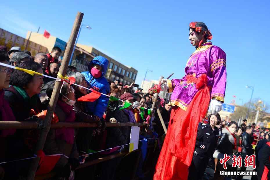3月1日,踩高跷演员与观众打招呼。当日,内蒙古呼和浩特市托克托县举办庆祝元宵节社火表演,跑驴、抬皇杠、踩高跷、扮丑等表演纷纷亮相,演员多为村民,他们边走边舞,引来很多人看热闹。中新社记者刘文华 摄
