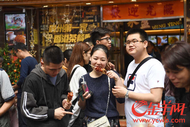 今年61岁的李阿姨中午特意不吃午饭,来到美食区开吃。“我每年都会来庙会吃东西,买这家的鸡,再点半份鲮鱼包、半份艇仔丸,一份炖蛋。”李阿姨告诉记者,“广府庙会一年比一年美食种类多,价格没有很大的变化,自己来这里吃得很开心。”