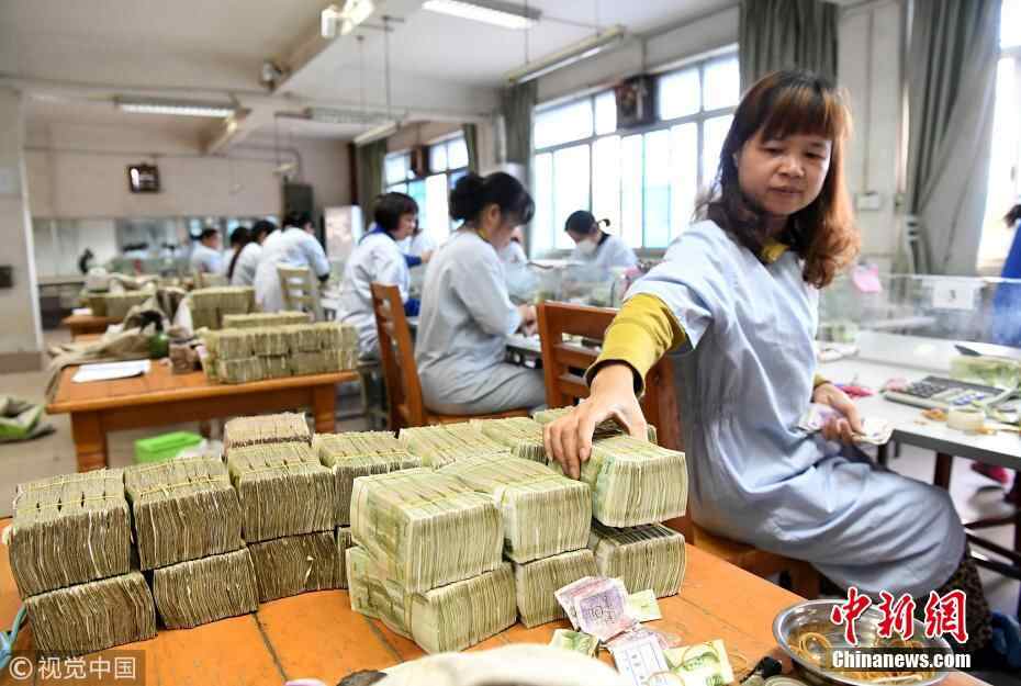 女点钞员将整理好的纸币摆放在一起。黎寒池 摄图片来源:视觉中国