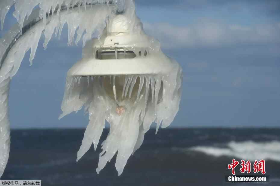 近日,欧洲多地迎来降雪降温天气。图为当地时间3月17日,德国波罗的海沿海地区的灯被冰覆盖。