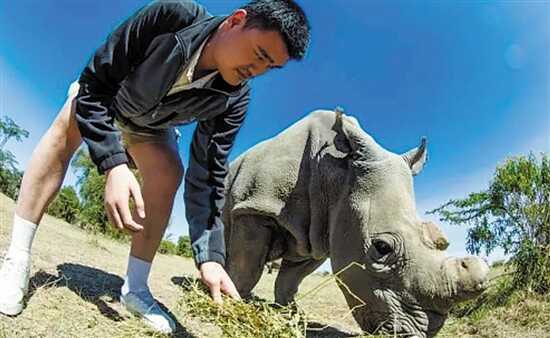 2012年,姚明跟随WildAid前往肯尼亚OlPejeta保护区探望苏丹,当时苏丹的身体状况还比较好 摄影/CKristen Schmidt