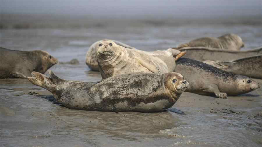 3月25日,一群斑海豹在辽宁盘锦双台河口三道沟海域的滩涂上休息。新华社记者潘昱龙摄