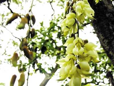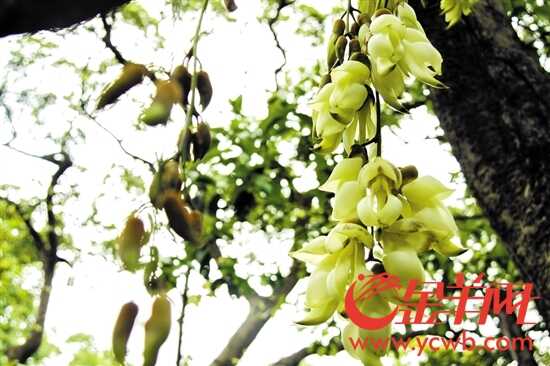 南丹山这一片禾雀花位于半山腰水灵谷旁边,正是花期,只见花藤上,禾雀花串串开放,三五成群互聚相拥,一只只小麻雀停落在枝条上,头、嘴、翼、尾俱全。花开在手臂粗的老藤上,可见这些花已经有很长的花龄了。它既不像其他花儿那样含苞欲放,也不会完全盛开。花开时,它的花瓣卷拢成翅状,整个花体通透玲珑,初开时为乳白色或者淡绿色,盛开时色如柠檬黄,再变为粉红色和橙红色,可谓神奇。