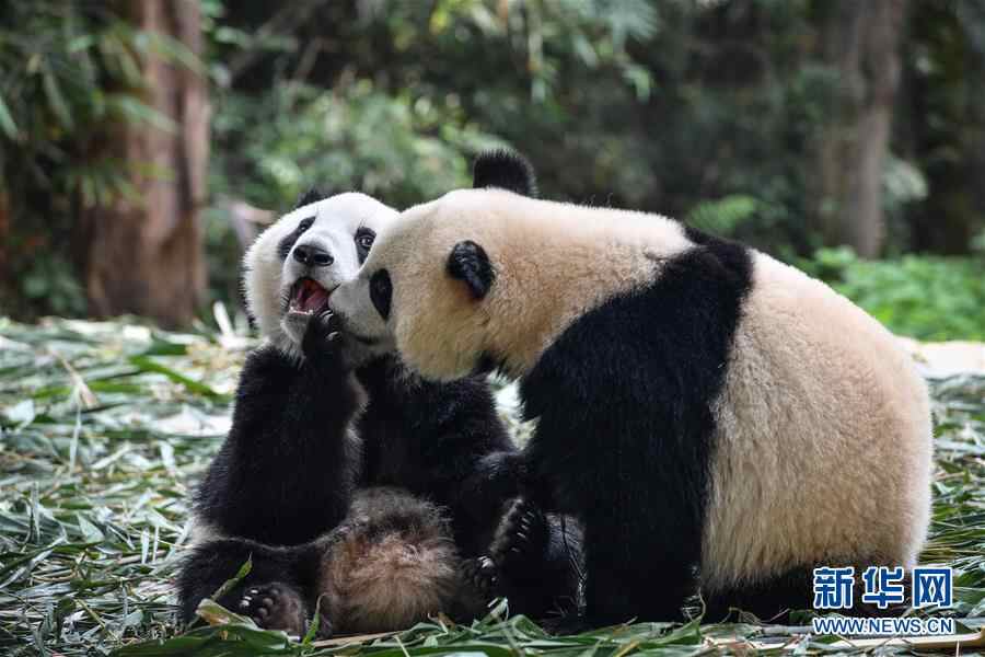 3月28日,广州长隆野生动物世界的大熊猫双胞胎“亲亲”和“爱爱”在嬉戏。新华社记者刘大伟摄