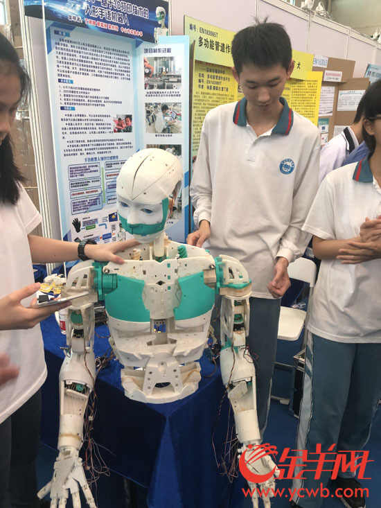 今年中山实验中学学生丁翊珊团队带来参赛作品“人形手语机器人”。她在学校开设的3D打印课程基础上,进行深入学习,经过一年的模型构建、组装和测试,使得机器人最终成型,并设计了一款与之相配套的语音识别应用软件。只要对着手机说话,机器人在识别语音后,就可以将其翻译为手语动作,各个手指的每个关节都可以精细移动。“未来机器人可以运用在特殊学校和公共场所,希望能够帮助中国2057万听力语言残障人士提供学习和生活的便利。”丁翊珊说。