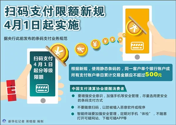 扫码支付限额新规正式实施,根据新规,使用静态条码的,同一客户单个银行账户或所有支付账户单日累计交易金额应不超过500元。