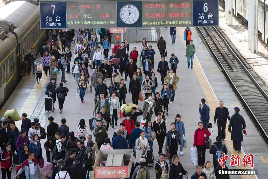 4月7日,山西太原火车站,大量民众正走向站台。当日,中国铁路总公司披露,中国铁路预计发送旅客1369万人次,预计增开旅客列车444列,其中跨铁路局中长途旅客列车91列,铁路局管内旅客列车353列。张云 摄