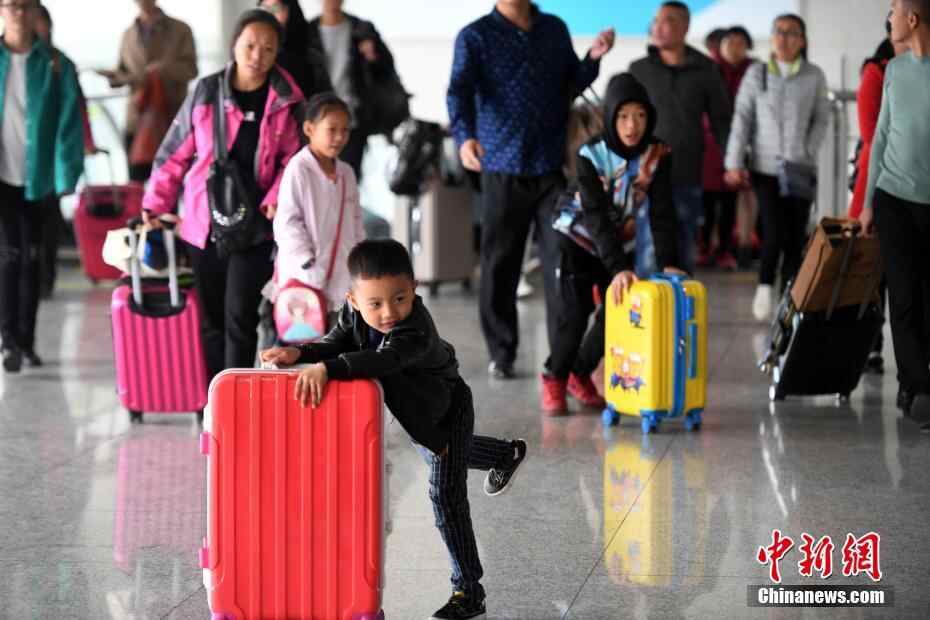 4月7日,等候乘车的小朋友。当日,昆明南站迎来清明假期返程客流高峰。 中新社记者 李进红 摄