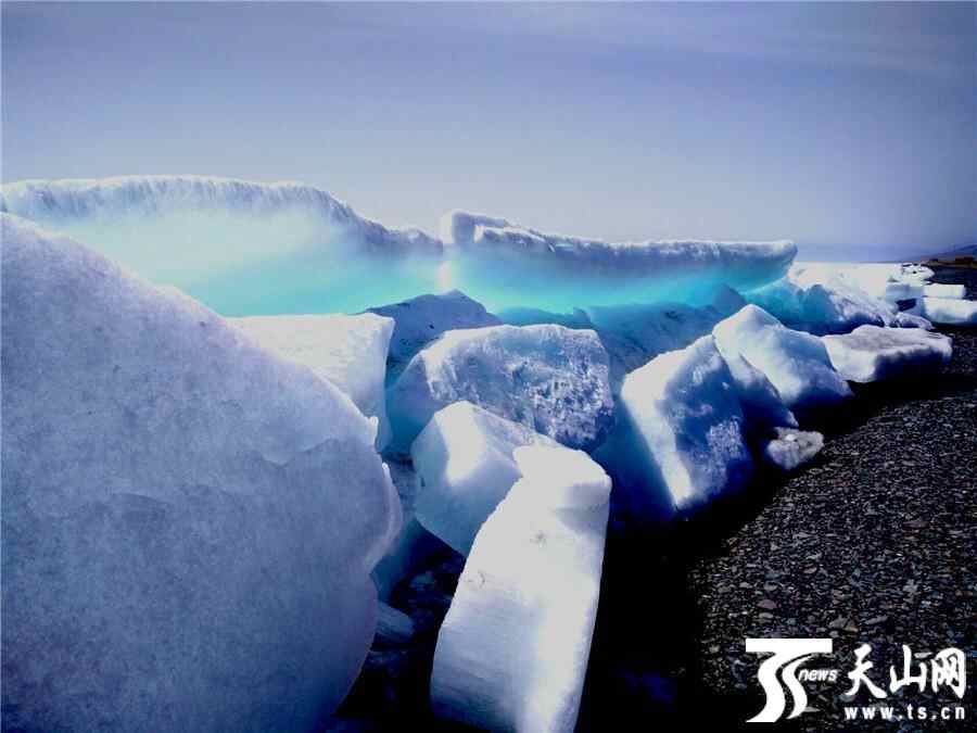 在赛里木湖边,游客被眼前的景象惊呆了,足有40公分厚的巨大冰块不规则地堆在湖岸,冰与冰的缝隙,就像安装了LED灯带一样,发出淡蓝色的光,非常神奇。许多游客表示,这样的冰块还是第一次见到。
