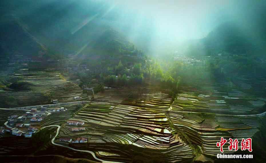 “要致富先修路”,1970年7月1日成昆铁路通车,如今该条铁路已运行了48年,全线有隧道427座,桥梁990座,是国家I级单线电气化铁路。图为阳光下,成昆铁路沿线的村寨与梯田。