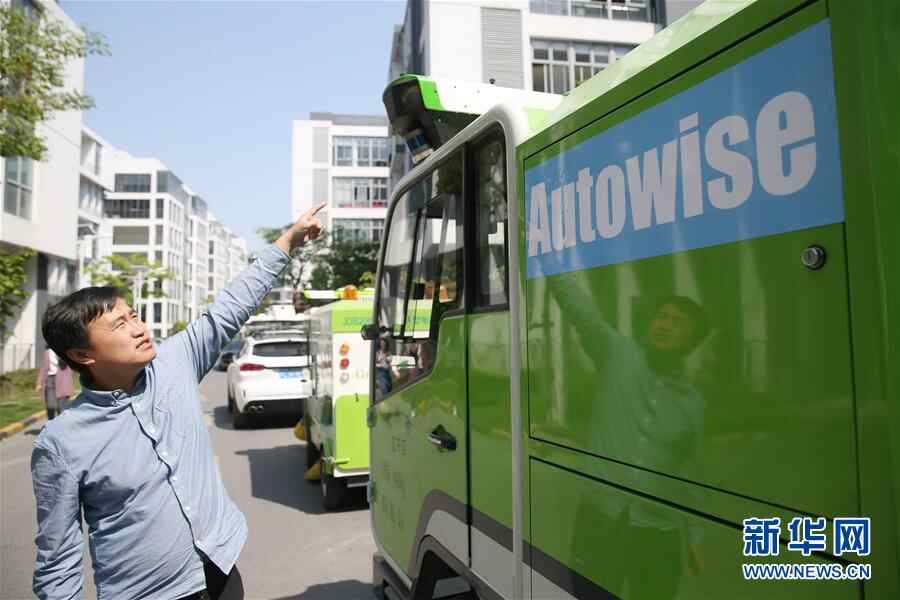 4月18日,在上海启迪漕河泾(中山)科技园,工作人员介绍无人驾驶清洁车队车顶上的传感器功能。近日,无人驾驶清洁车队亮相上海市松江区,并在上海启迪漕河泾(中山)科技园试运营。该车队由一辆6米长的中型清洁车以及一辆3米长的小型清洁车组成,可自动启动、自动清扫、自动通过红绿灯、自动避开路边障碍等。新华社记者丁汀 摄