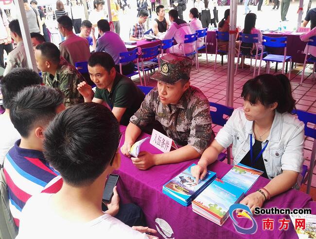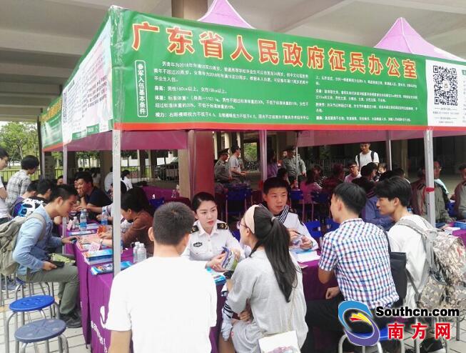 南方网讯莘莘学子当立志,携笔从戎固国防。为点燃大学生参军报国热情,4月21日,省征兵办会同广州市征兵办以及驻穗部队优秀官兵代表,在广东工业大学大学城校区举办的综合类毕业生招聘会上设立咨询站,现场为青年学生提供咨询服务,通过“面对面”“点对点”的宣传,宣讲我省大学生参军入伍优惠激励政策,解答广大青年学子参军入伍相关问题。活动现场,青年学生们兴致高昂地观看了征兵宣传片,领取了政策宣传手册,并现场向工作人员咨询应征报名的相关政策。