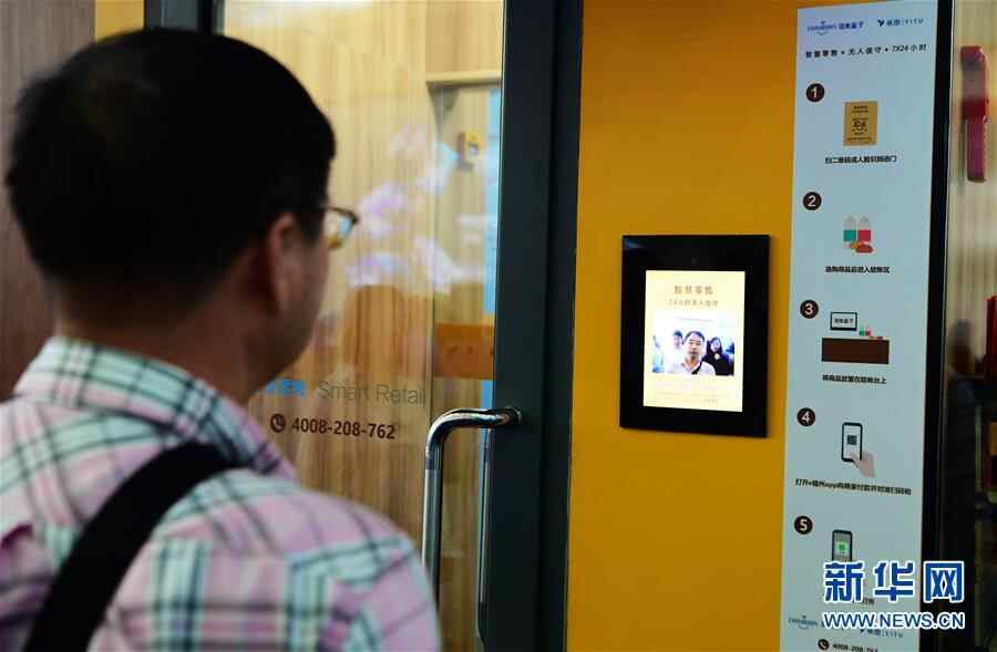 4月22日,一名市民在数字应用体验区的“无人值守智慧零售超市”门前,准备通过人脸识别系统扫描进入超市。当日,在福州举行的首届数字中国建设成果展览会向公众开放。本次展览会设置了2000平米的数字应用体验区,模拟9大便民步舞场景,观众客通过下载手机APP即可现场体验体验最新的数字科技。新华社记者魏培全摄