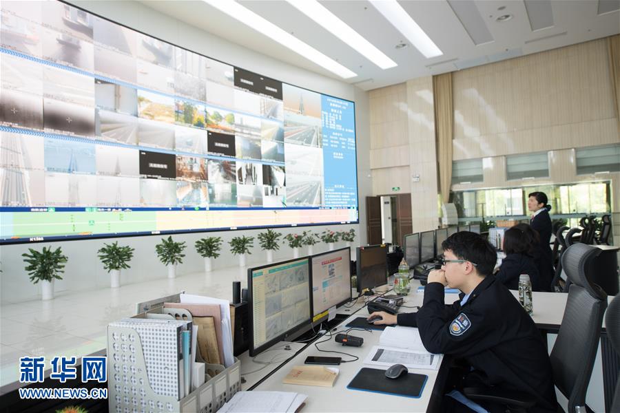 工作人员在杭州湾跨海大桥监控中心进行实时监控(4月19日摄)。