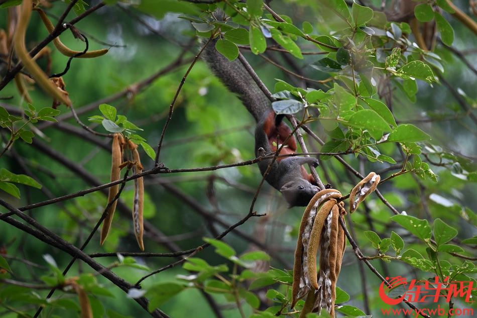 小松鼠们上蹿下跳,啃个不停。记者 陈秋明 摄