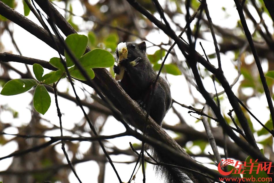 小松鼠们上蹿下跳,啃个不停。记者 陈秋明 摄