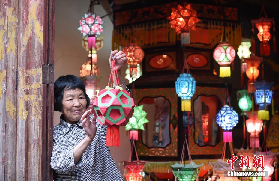 王汝兰展示一只针刺无骨花灯。中新社记者侯宇摄