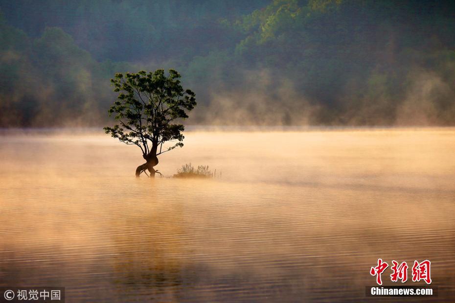 5月4日,安徽黄山,雾霭缥缈的黄山奇墅湖美景。当日,阵阵春雨过后,天空放晴。群山环抱的安徽皖南黄山奇墅湖雾气氤氲,晨曦初露的阳光洒满整个宽广的湖面,流光闪烁,熠熠生辉,宛如仙境。施广德摄图片来源:视觉中国