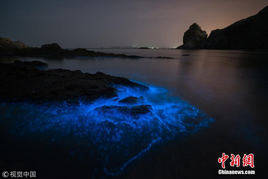 夜幕降临,泛着蓝光的海浪拍打着岸边的礁石,不时飞溅起晶莹剔透的浪花。走在海边的沙滩上,脚底留下一串串蓝色的脚印,仿佛在星空漫步。 赵相勇 摄 图片来源:视觉中国