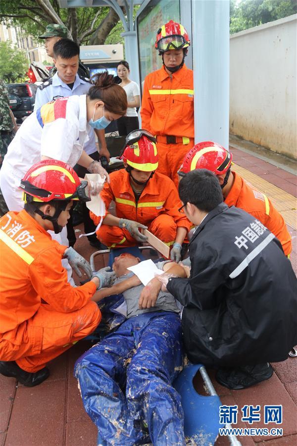 5月7日,在厦门市五缘湾路,倒塌的围墙压住一名行人,消防官兵和医护人员为其紧急救护。 当日,一场特大暴雨突袭福建厦门。厦门岛内多处路段出现严重积水,道路封闭,有关部门采取措施,转移被困人员、及时排除积水。新华社发(曾德猛 摄)