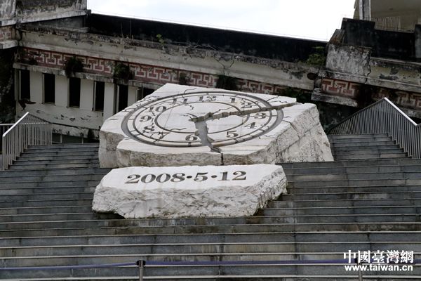 走进漩口中学大门,最先映入眼帘的是一个硕大的表盘,上面清晰地显示着地震发生的时间——下午两点二十八分。沈文娟说,由于大地震导致教学楼剧烈摇晃,当时一间教室里的时钟摔落到了地上,于是人们把钟的破碎装放大,就做成了现在这面记事钟。