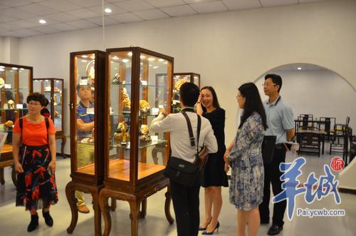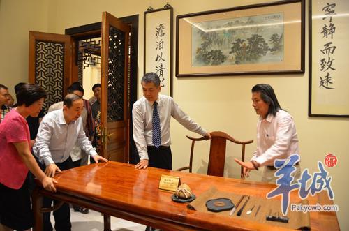 伍炳亮大师(右一)向嘉宾介绍黄花梨艺博馆家具藏品