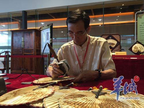 其中,廖惠林、张瑞亨、巢烜宝等大师现场演示了制作工艺,赢得观众的赞誉。新会葵艺传承人廖惠林介绍,以前制作葵扇时烙画用火炉来烙很难把握,现在改用电笔后,可以调温度,已经可以实现类似国画的效果。张瑞亨则介绍,传统茅龙笔以新会圭峰山特有的茅草为原材料,笔锋很长,适合画大画写大字,而现在制作过程中加入葵骨,使得使得新型茅龙笔书笔刚柔并重。