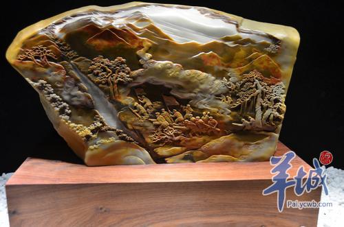 本次活动的另一个亮点就是台山玉。现场展示的作品中,从小巧精致的印章、吊坠,气势恢宏的山水作品,到宁静庄严的宗教作品应有尽有。