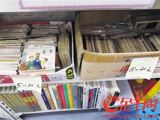 龙贤君的二手书店面积不到50平方米,靠墙两侧摆满了各种类型旧书,每个柜台上都有诸如“历史”、“文学”等标签,方便读者按需选用。记者看到,一批旧得泛黄的书籍占比很大,而且纸张越旧越黄的书籍标价越高。