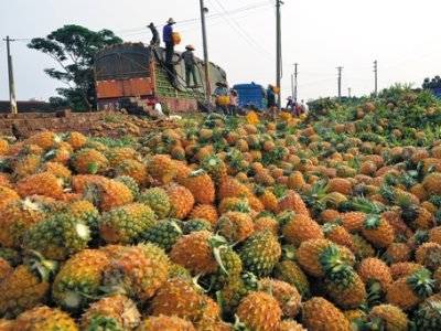 收购商张火南说:“我们把菠萝拉到湛江批发市场卖每斤五六毛,除去运费装车费,只赚到工钱。”他在湛江还积压3000多斤存量,这两天如销不完,得亏本。