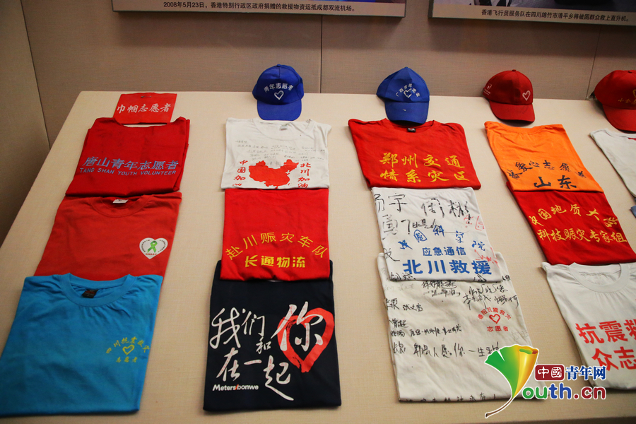 5·12汶川特大地震纪念馆内展示的全国各地志愿者、救援人员穿着的短袖衣服。高寒摄
