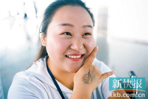 24岁的何静现在已经是一名建筑设计师,对广州塔“小蛮腰”的外形特别喜欢。在看到邮局可以盖纪念邮戳后,她兴奋地将邮戳盖在了自己的手上,还用油墨在旁边画了两片云彩。她写好了明信片后,表示要寄给妹妹和好朋友。