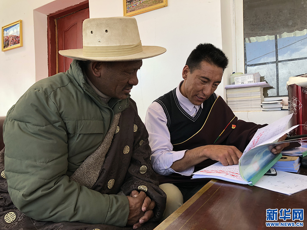 岗莎村党支部副书记兼村主任久美多吉(右)和牦牛运输服务队一组组长(左)正在核算收入。新华网雪珍摄