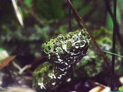 只见它全身披着浅绿至墨绿色的斑纹,很像树皮苔藓,又像阴暗石头上的青苔。它懒懒地、行动缓慢,却又时不时非常警觉地抬起头,蛇身向后呈“S”形,随时做好攻击的姿势。一般人见了,可认不出它来,但科学家却欣喜地一眼就认出了它:这就是国宝级珍稀物种“莽山烙铁头蛇”!