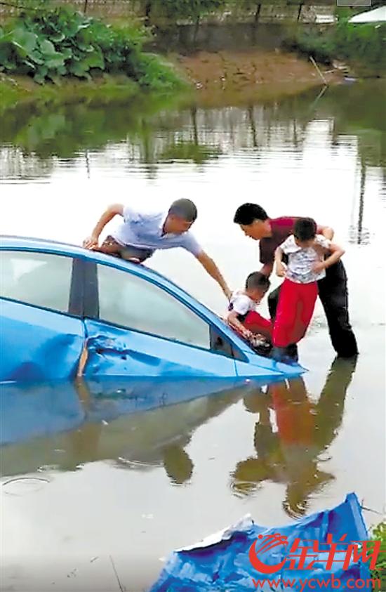 佛山一轿车失控冲进鱼塘 男子下水救出5人