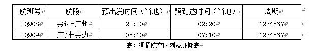 金羊网讯 澜湄航空于2018年5月16日正式启航广州至金边的直飞新航线。该航线由A319客机执飞,全经济舱布局,每周7班。具体航班信息如下: