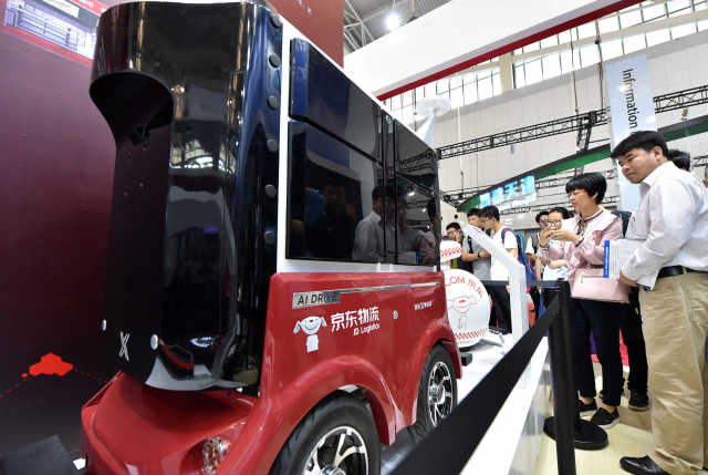 5月17日,观众在天津梅江会展中心智能科技展上参观京东物流车。新华社记者 李然 摄
