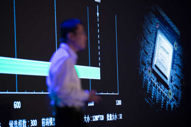5月3日,在上海国际会议中心举行的发布会上,寒武纪科技公司首席执行官陈天石介绍新发布的国内首款云端人工智能芯片。新华社记者 金立旺 摄